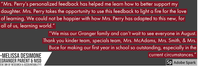 Engaging students in their learning is one of Mrs. Embry’s favorite aspects of Seesaw. She states, “Seesaw provides me the opportunity to create engaging lessons that allow students to respond in a way they are comfortable with. They can create a picture with drawing tools, type, or create a video.” Mrs. Embry, Mrs. Davis, and the Granger second grade team have personalized reading assignments by linking in an Adobe Spark video encouraging students to find fun places to read as they work on their reading stamina. It's fun for students to connect with their teachers by seeing them teach and encourage in the videos they send home.